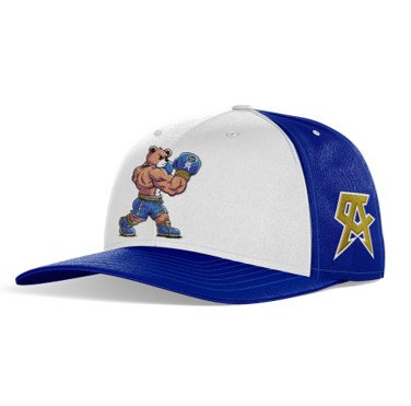 Estilo audaz y original: combina una base blanca con paneles y visera azul intenso que dan un contraste llamativo. En el frente destaca un gráfico bordado de un oso musculoso con guantes de box, reflejando fuerza, actitud y personalidad, inspirado en el estilo irreverente de Canelo.